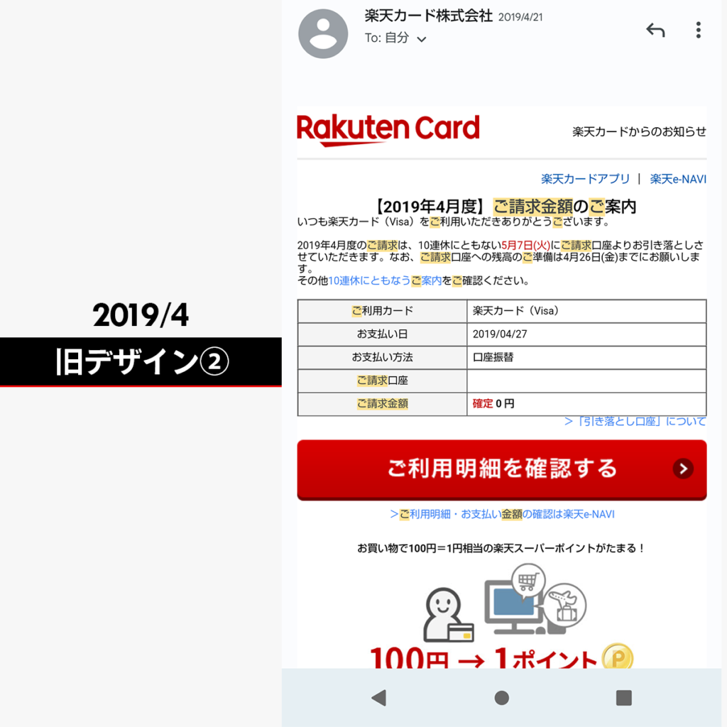 途中の「デザインシステム活用事例」の画像を見て、いつも適当に流し見していた楽天のメールもデザインが変わっていたのでは…!と気付いたので、ここ数年のメールを比較してみました。